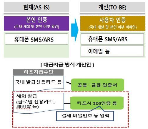 대금지급 수단도 확대해야 한다고 덧붙였다. 국내 온라인 쇼핑몰이 해외 발급카드로 결제하는 것을 꺼리는 이유는 지급수단 도용 분쟁 등에 대한 대응 부담, 손실발생 우려 때문이다. 지급 카드 거래 승인시 비밀번호 입력을 의무화하고, 해외 발급 지급카드가 확대될 수 있도록 해외 발급 거래카드 거래에 대한 가맹점 수수료가 인하해야 한다는 설명이다.
