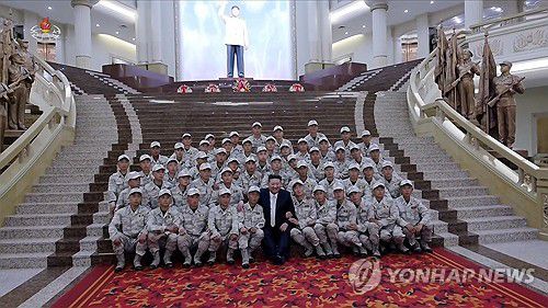 (서울=연합뉴스) 김정은 북한 국무위원장이 지난 26일 조국해방전쟁승리 72주년 경축행사에 특별 초청된 인민군 제4군단 28보병사단 16포병연대 3대대 2중대 지휘관과 병사들을 만나 기념사진을 촬영했다고 조선중앙TV가 28일 보도했다. [조선중앙TV화면] 2025.7.28