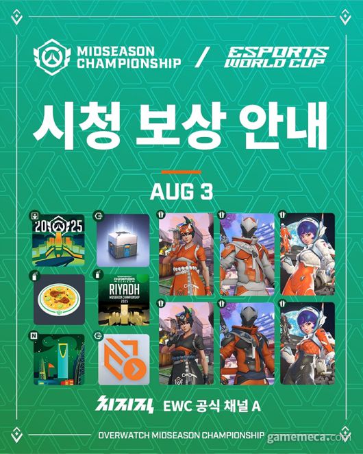 방송을 통해 대회를 함께 할 시청자를 위한 보상도 준비되어 있다. 경기가 진행되는 4일 동안 매일 누적 시청 시간에 따라 스프레이와 아이콘, 프로필 카드, 전리품 상자와 키리코, 겐지, 주노 등 오버워치를 대표하는 영웅들의 스킨 등 다양한 보상을 제공한다. 시청 보상은 치지직 드롭스를 통해 획득할 수 있으며, 네이버 계정에 로그인한 뒤 치지직 공식 채널 및 코스트리머 채널에서 e스포츠 월드컵(EWC)을 시청해 획득할 수 있다.;