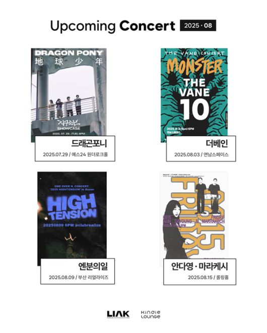 한국음악레이블산업협회(음레협)가 운영하는 킨디라운지는 8월에도 다양한 장르와 콘셉트의 공연 소개를 통해 대중음악의 생동감을 전달한다. 신곡 발표와 함께 열리는 쇼케이스부터 데뷔 10주년을 기념하는 단독 콘서트, 전국 투어와 합동 공연까지 무대와 관객이 함께 호흡하는 순간들을 소개한다.
