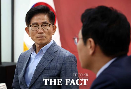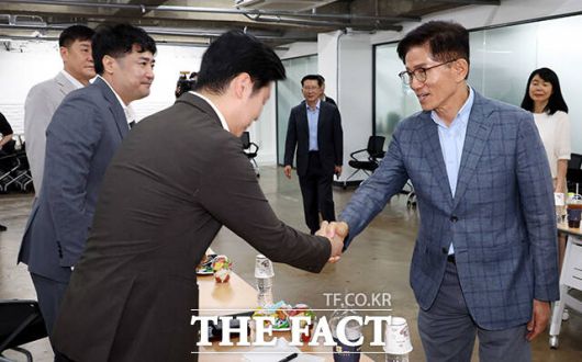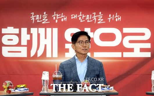 [더팩트ㅣ국회=배정한 기자] 김문수 국민의힘 당대표 예비후보가 28일 오후 서울 여의도 국민의힘 서울시당에서 열린 당원간담회에 참석해 관계자들과 대화를 하고 있다.