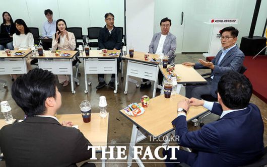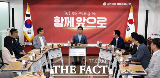 김문수 국민의힘 당대표 예비후보가 28일 오후 서울 여의도 국민의힘 서울시당에서 열린 당원간담회에 참석해 관계자들과 대화를 하고 있다. /배정한 기자 |