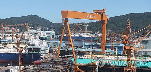 (거제=연합뉴스) 김동민 기자 = 한미 관세 협상 시한을 나흘 앞둔 28일 경남 거제시 아주동 한화오션 본사에 대형 크레인이 보인다. 2025.7.28
