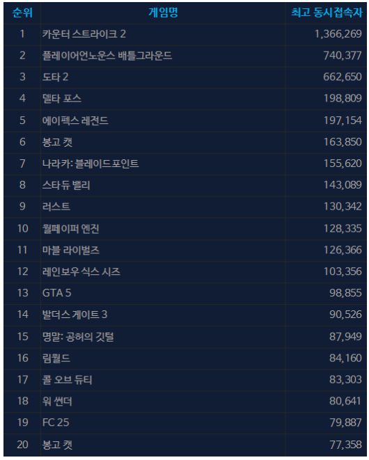 ▲ 7월 28일 오후 2시 30분 기준 스팀 일 최고 동시접속자 TOP 20 (자료출처: 스팀) |