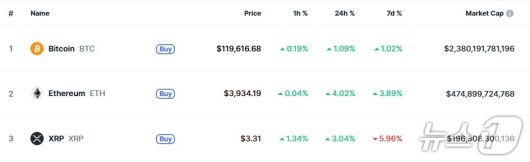 28일 오후 3시 20분 현재 글로벌 코인 시황 중계사이트인 코인마켓캡에서 비트코인은 1.09% 상승한 11만9616달러를 기록하고 있다.