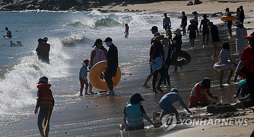 (거제=연합뉴스) 김동민 기자 = 폭염이 이어진 28일 오후 경남 거제시 일운면 구조라해수욕장을 찾은 피서객이 물놀이를 즐기고 있다. 2025.7.28