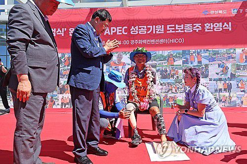(경주=연합뉴스) 손대성 기자 = 아시아태평양경제협력체(APEC) 정상회의 홍보와 동서화합을 기원하며 22일간 400㎞를 걸은 '왼발박사' 이범식씨가 28일 APEC 정상회의장인 경북 경주화백컨벤션센터에 도착해 맨발 형태를 남기는 풋 프린팅을 하고 있다. 2025.7.28