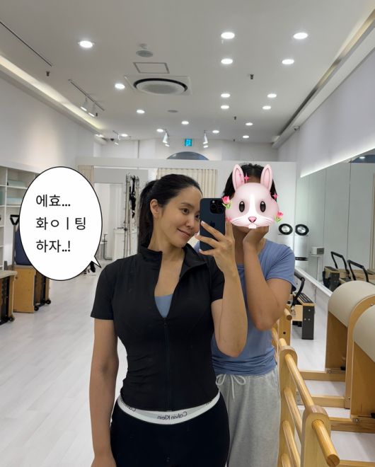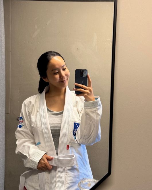 또 다른 사진에서는 검은색 도복을 입은 채 딸과 함께 거울 앞에서 포즈를 취했다. 반복적인 운동을 통한 건강 다이어트에 대한 박지윤의 의지가 엿보인다.
