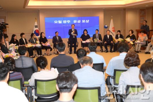 광주광역시(시장 강기정)는 28일 시청 비즈니스룸에서 '2025 오월광주 유공자 포상식'을 열어 제45주년 5·18민주화운동 기념행사의 성공 개최에 기여한 유공자와 단체를 표창했다.