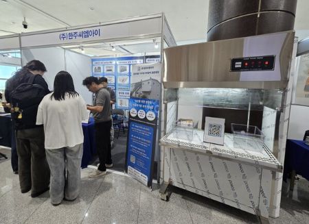 한주씨엠아이가 최근 열린 '2025 한국실험동물학회 국제학술대회'에서 부스를 차리고 자사 제푸믈 소개했다. 사진 속 자동 케이지 교환장치는 실험동물 간 교차 오염을 줄이고 작업자의 피로도를 낮춰 현장 연구자들로부터 호평받고 있다. [사진 한주씨엠아이] |
