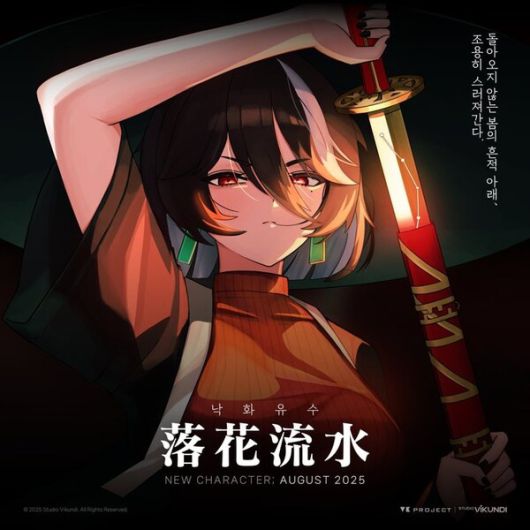 스튜디오 비쿤디는 공식 SNS로 "돌아오지 않는 봄의 흔적 아래 조용히 스러져 간다"며 낙화유수라는 타이틀과 함께 2025년 8월 신규 캐릭터 공개를 암시했다. 또한 "■■■에서 가장 불행한 건 고작 우리일 거다. 참 좋은 곳이지?"라는 의문의 메시지도 덧붙였다.