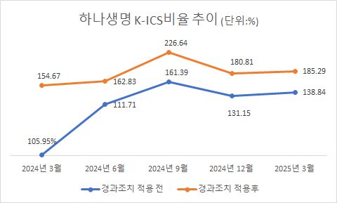 최근 금융당국이 보험사들의 K-ICS비율 기준을 150%에서 130%로 하향 조정하면서 하나생명은 경과조치 적용 후와 전 모두 기준치를 웃돌고 있다.