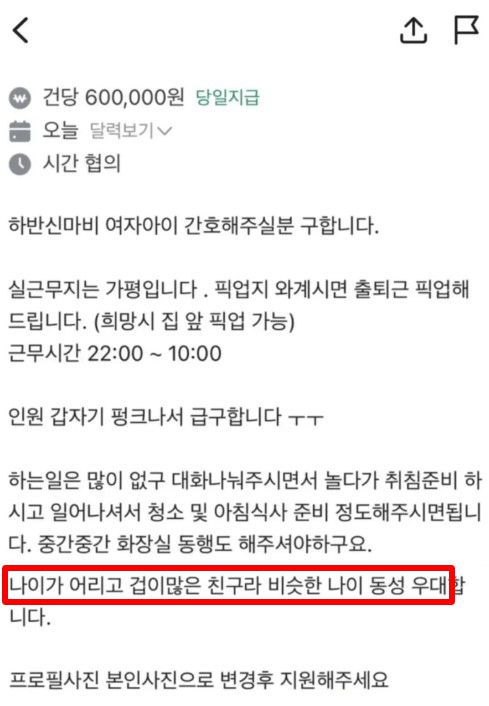안 씨는 공고에서 "실 근무지는 가평, 픽업 장소 와서 계시면 출퇴근 픽업해드린다", "근무 시간은 오후 10시부터 다음날 오전 10시까지다", "하는 일은 많이 없고 대화 나눠주시면서 놀다가 취침 준비하시고, 중간중간 화장실 동행해 주시고, 일어나셔서 청소 및 아침 식사 준비해 주시면 된다"면서 업무 강도가 높지 않다는 점을 어필하기도 했다.