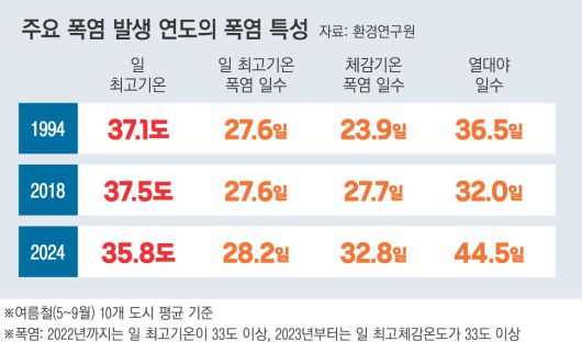 28일 한국환경연구원이 발간한 ‘2024년 극한기후영향 보고서’를 보면 한국에서 주요 폭염의 해로 기록된 해는 1994년, 2018년, 2024년이다. 모두 더웠지만 폭염 양상은 조금씩 달랐다.