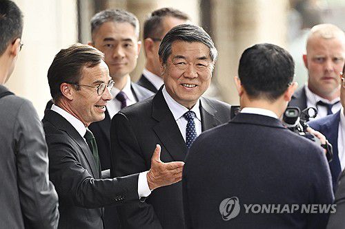 무역협상 위해 스웨덴 스톡홀름 도착해 울프 크리스테르손 스웨덴 총리와 이야기 나누는 허리펑 중국 부총리(가운데). [AP=연합뉴스. 재판매 및 DB 금지] |