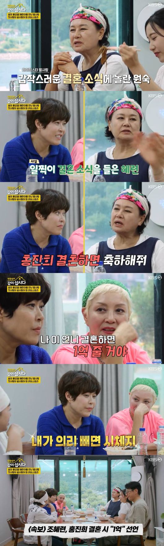 중학교 때 첫사랑과 5년 열애 끝 결혼한다고 밝혔고, 박원숙은 조혜련에게 "홍진희 결혼하면 축하해줘"라고 말했다. 이에 조혜련은 "나 이언니 결혼하면 1억 줄거야"라며 통 큰 면모를 보이며 의리를 자랑했다. 자막에는 '의리빼면 시체'라는 글이 이어져 눈길을 끌었다.