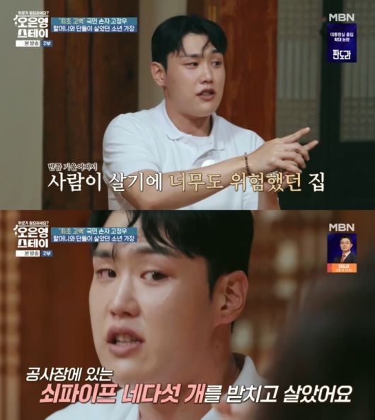 고정우는 2살 때부터 할머니 손에 자랐다며 “커서 알았는데 큰아버지의 보증으로 집이 경매로 넘어갔다. 그래서 갈 데가 없었다. 동네에 다 쓰러져 가고 오래전에 인적이 끊긴 폐가가 있어서 연락했더니 주인도 너무 위험해서 못 준다고 하더라. 그런데 할머니가 나를 키워야 하고 먹여 살려야 하니까 제발 살게 해달라고 읍소했다. 공사장에 있는 쇠 파이프 4~5개를 받치고 살았다”고 회상했다.