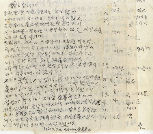 “敬子(경자)양에게/ 요전번 보내준 편지는 고마웠지. 여러가지 뉴-스도 들으니 즐거웠고. 요즘 우리는 展示會(전시회) 관계로 좀 분망하지. 뉴-요크展(전)이 끝나면 4月中旬(4월중순)에 있을 와싱톤展으로 또 분주할거야. 동봉하는 편지는 비행장에 나와준 미술과 학생들에게 주는 글이니까 洋畵部(양화부) 학생들과 2학년이었던 …”.
