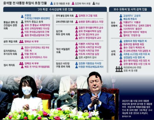윤석열 전 대통령 부부 관련 수사를 진행하는 3개 특검의 수사 대상 가운데 적어도 30여 명이 2022년 5월 대통령 취임식에 초청됐던 인물인 것으로 나타났다. 동아일보가 당시 참석자 4만여 명 중 ‘대통령 특별초청’ 대상이 된 2700여 명 명단을 입수해 확인한 결과 건진법사 의혹, 도이치모터스 주가 조작, 공천 개입 등 사건 관련자들이 포함돼 있었다.