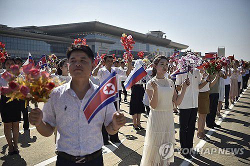 모스크바-평양 직항기 도착 환영하는 북한인들 |