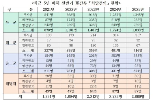 군별로 보면 육군 간부들이 2021년(전반기) 870명→2025년(전반기) 1839명, 같은 기간 해군 간부들이 227명→416명, 공군 간부들이 211명→527명, 해병대 간부들이 43명→87명으로 희망전역 했다. 4년새 공군이 약 2.5배로 군 가운데 가장 가파르게 증가세를 보였다. 다음으로 육군 약 2.1배, 해병대 약 2.0배, 해군 약 1.8배 순이었다.