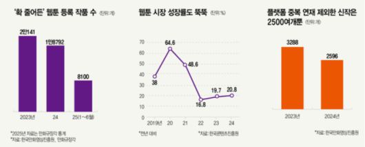 한 웹툰 스튜디오 관계자는 “양산형 로맨스와 스릴러, 여기에 회빙환 콘텐츠가 쏟아지면서 팬덤 피로감이 커지고 있다”며 “또 단기간 내 웹소설 웹툰화가 너무 늘어나다 보니, 웬만한 인기 웹소설은 이미 다 다루게 됐다. 웹소설 IP 고갈에 직면한 상황에서 웹툰 시장 성장도 정체를 맞을 수 있다”고 설명했다.