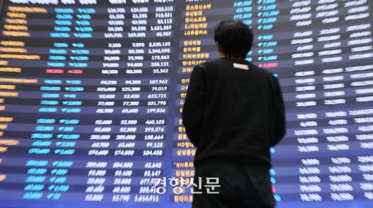 서울 여의도 한국거래소 홍보관에서 한 시민이 전광판 앞을 지나는 모습. [사진 연합뉴스] |