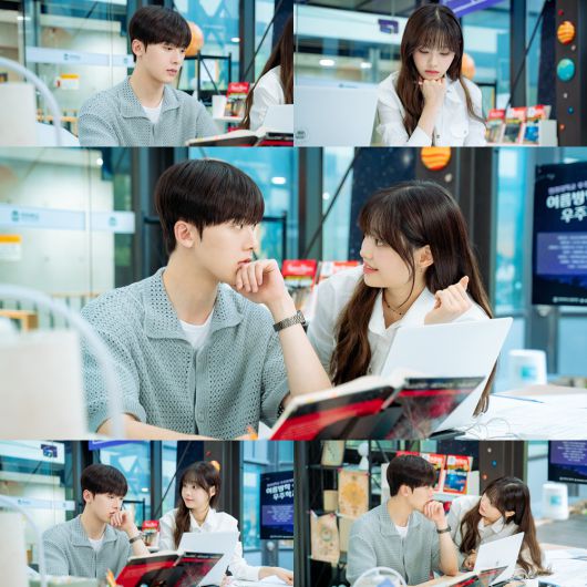 이와 관련 오는 30일(수) 방송될 3회에서 윤산하와 츄가 본격적으로 얽히는 장면이 포착돼 이목이 집중된다. 극 중 박윤재와 강민주(츄)가 과방에서 세미나 발표를 준비하던 도중 강민주의 은근한 직진 행보가 포착되는 장면. 박윤재는 평소와 다르게 멍한 얼굴을 보이고, 박윤재를 세심하게 관찰하던 강민주는 얼굴을 빼꼼 내밀고 환하게 웃어 아이 컨택을 완성한다. 과연 박윤재는 왜 여자친구가 본 모습을 되찾았는데도 표정이 어두운 것인지, 박윤재의 이상 기온을 캐치한 강민주는 빈틈을 노릴 수 있을지 귀추가 주목된다.