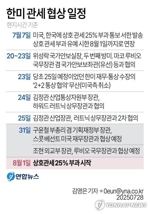 (워싱턴=연합뉴스) 박성민 특파원 = 도널드 트럼프 미국 행정부가 상호관세 부과 시점으로 예고한 내달 1일(현지시간)을 앞두고, 정부가 그 이전에 한미간 무역협상을 타결하기 위해 총력전을 펼치고 있다.