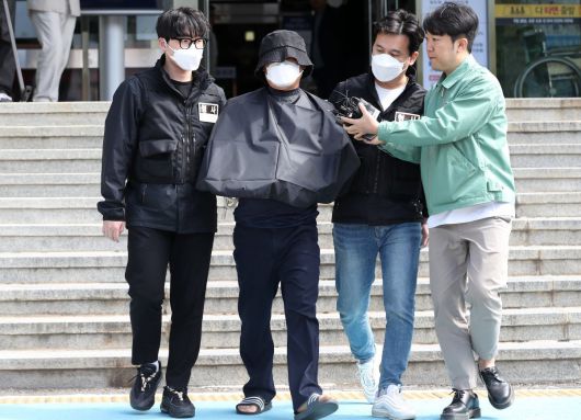 특정범죄가중처벌법(특가법)상 보복살인 혐의를 받는 50대 유튜버 홍모 씨가 지난해 5월 16일 오전 부산 연제구 연제경찰서에서 검찰로 송치되고 있다. 뉴스1 |