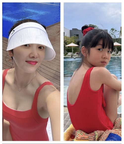 눈길을 끈 건 빨간색 원피스 수영복을 나란히 입은 엄마 소이현과 딸의 모습. 소이현은 살짝 미소를 머금은 채 하얀 썬캡을 눌러썼고, 딸은 뒤돌아 앉은 채 수영장 물빛을 배경으로 정면을 응시하고 있었다.