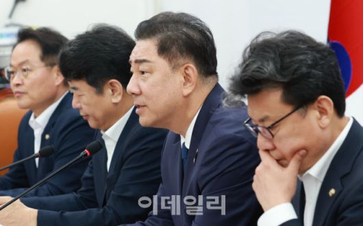 [이데일리 노진환 기자] 김병기 더불어민주당 당대표 직무대행 겸 원내대표가 29일 오전 서울 여의도 국회에서 열린 원내대책회의에서 모두발언을 하고 있다.