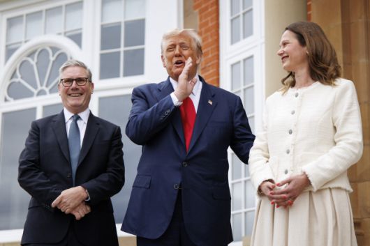 (왼쪽부터) 키어 스타머 영국 총리, 도널드 트럼프 미국 대통령, 그리고 스타머 영국 총리 영부인 빅토리아 스타머가 28일(현지시간) 영국 스코틀랜드 턴베리의 트럼프 턴베리 골프 리조트에서 열리는 정상 회담에 앞서 언론과 대화하고 있다. 트럼프 대통령은 자신의 골프장을 방문하기 위해 스코틀랜드를 비공식적으로 방문 중이다. /EPA·연합 |