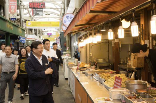 김경호 광진구청장이 자양전통시장에 방문해 상인들과 인사를 나누고 있는 모습. 광진구 제공. |