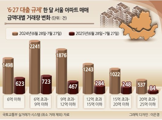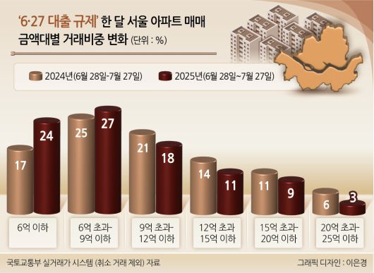 이번 6·27 부동산 대책으로 수도권 주택담보대출 한도가 6억원으로 줄고 소유권 이전 조건부 전세대출 등이 막혀 ‘갭투자’(전세 끼고 매매)가 어려워진 영향으로 해석된다. 실제로 지역별 아파트 거래 비중을 살펴보면 일부 강남권과 ‘한강 벨트’ 비중은 낮아졌지만, 관악구·구로구·도봉구 등 비핵심지 아파트 비중은 증가했다.