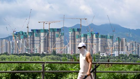 서울 용산구 한강공원에서 바라본 서초구의 한 아파트 건설현장 모습. [임세준 기자] |