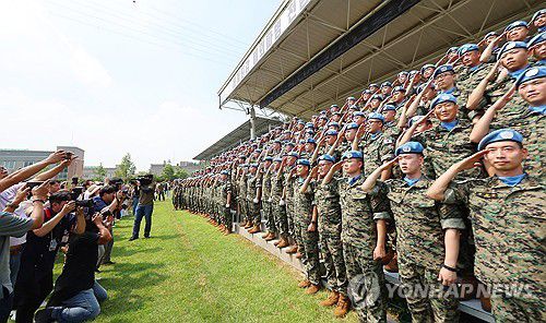 (인천=연합뉴스) 임순석 기자 = 29일 인천 계양구 국제평화지원단에서 열린 남수단 재건지원단 '한빛부대 20진 파병 환송식'에서 대원들이 환송 나온 가족들에게 잘 다녀오겠다는 경례를 하고 있다. 한빛부대 20진은 아프리카 남수단으로 파병돼 8개월간 유엔 평화유지활동(PKO) 임무를 수행할 예정이다. 2025.7.29