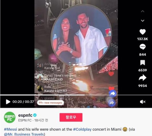 미국 USA투데이 등은 메시와 그의 아내 안토넬라 로쿠소가 27일 밤(현지시간) 미 플로리다주 마이애미 하드록스타디움에서 열린 콜드플레이의 콘서트를 관람하던 중 '키스캠'에 잡혔다고 28일 보도했다. 메시 부부는 환하게 웃으며 카메라를 향해 손을 흔들었지만, 쑥스러워하며 공개 키스를 하진 않았다.