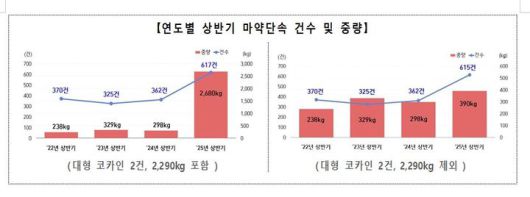 이 증 코카인은 지난해 상반기에 비해 적발 중량이 7941%(80배)나 증가했고.아시아 지역에서 남용되는 대표적인 마약류인 케타민은 우리나라도 지난 2022년부터 증가 추세를 보이며 올해 상반기에는 지난해 동기 대비 747%(8배)가 증가했다.