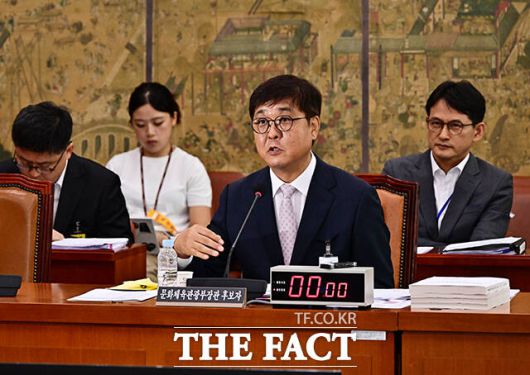 [더팩트ㅣ국회=배정한 기자] 최휘영 문화체육관광부 장관 후보자가 29일 오전 서울 여의도 국회에서 열린 인사청문회에 참석해 질의에 답변을 하고 있다.