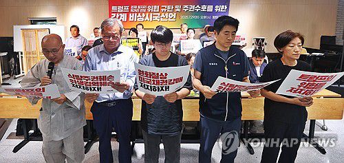 (서울=연합뉴스) 진연수 기자 = 트럼프위협저지공동행동과 시민사회단체가 29일 오후 서울 종로구 향린교회에서 트럼프 경제·일자리·먹거리·안보 위협 규탄 및 주권수호를 위한 각계 비상시국선언 기자회견을 하고 있다. 2025.7.29