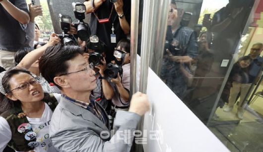 임성근 전 해병대 1사단장이 29일 업무상과실치사상 사건 신속 결정 요청서 제출을 위해 서울 서초구 순직해병특검을 찾았지만, 출입문이 닫혀 들어가지 못하고 있다.(사진=연합뉴스) |