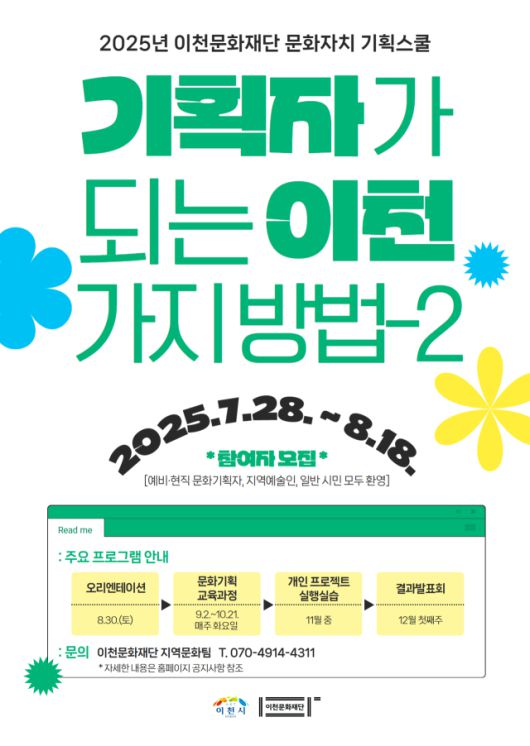경기 이천문화재단(이사장 김경희)은 2025 이천 문화자치 기획스쿨 ‘기획자가 되는 이천가지 방법 2’에 참여할 시민 기획자를 공개 모집한다.