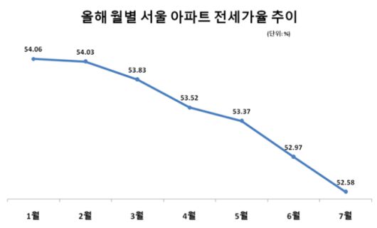29일 KB부동산 월간 통계에 따르면 서울 아파트 전세가율은 올해 1월 54.06%에서 7월 52.59%로 떨어지며 7개월 연속 하락세를 걷고 있다. 전세가율은 매매가격 대비 전세가격의 비율을 뜻하는 지표로 이 수치가 낮아질수록 매매가가 전세가보다 더 빠르게 오르고 있다는 의미다.