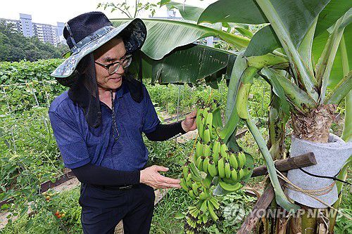 (서울=연합뉴스) 서대연 기자 = 연일 무더위가 이어지고 있는 29일 서울 노원구 천수주말농장 녹색어울림 교육장에서 이은수 녹색어울림 대표가 농장에 열린 바나나를 소개하고 있다. 2025.7.29