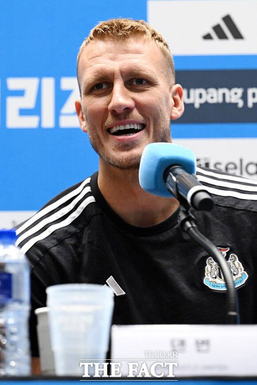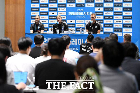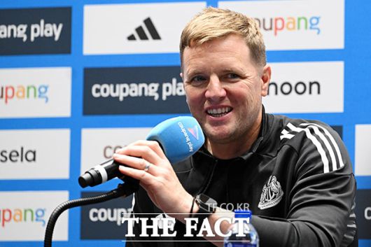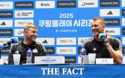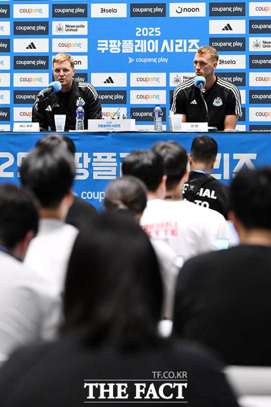 [더팩트ㅣ남용희 기자] 에디 하우 뉴캐슬 유나이티드 감독(왼쪽)과 댄 번이 29일 오후 서울 여의도 IFC 더 포럼에서 열린 2025 쿠팡플레이 시리즈 뉴캐슬 기자회견에서 취재진의 질문에 답하며 미소를 짓고 있다.
