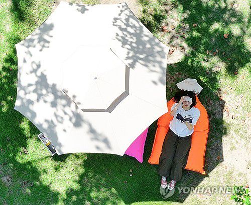 (대구=연합뉴스) 윤관식 기자 = 중복을 하루 앞두고 폭염이 이어진 29일 대구 수성구 수성패밀리파크에서 열린 '제9회 수성인문학제 수북수북 야외도서관' 행사를 찾은 한 시민이 파라솔 그늘에서 독서하며 더위를 식히고 있다. 2025.7.29