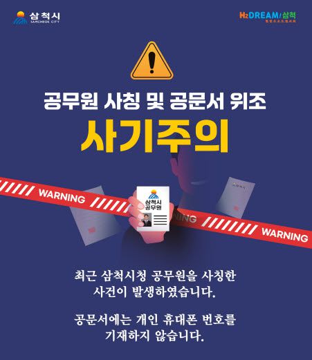 강원 삼척시는 최근 시청 공무원을 사칭한 보이스피싱 사례가 관내에서 잇따라 발생함에 따라 시민들의 피해 예방을 위해 각별한 주의를 당부했다.