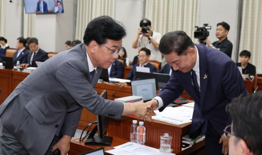 김병기 더불어민주당 대표 직무대행 겸 원내대표(오른쪽)와 송언석 국민의힘 비상대책위원장 겸 원내대표가 10일 오후 국회 운영위 전체회의에서 인사하고 있다. 임현동 기자. |