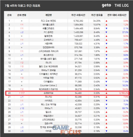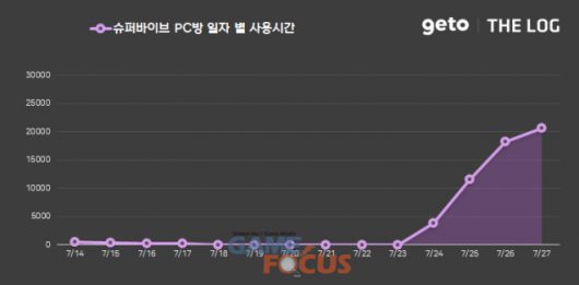 PC방 게임 통계 서비스 '더로그'에 따르면, '슈퍼바이브'는 정식 출시된 7월 넷째 주 117계단이나 상승한 20위(점유율 0.33%)에 오르면서 상위권에 진입했다. 전주 대비 사용시간은 무려 3765.2% 상승했으며, 주간 사용시간은 5만 4천여 시간을 기록했다.